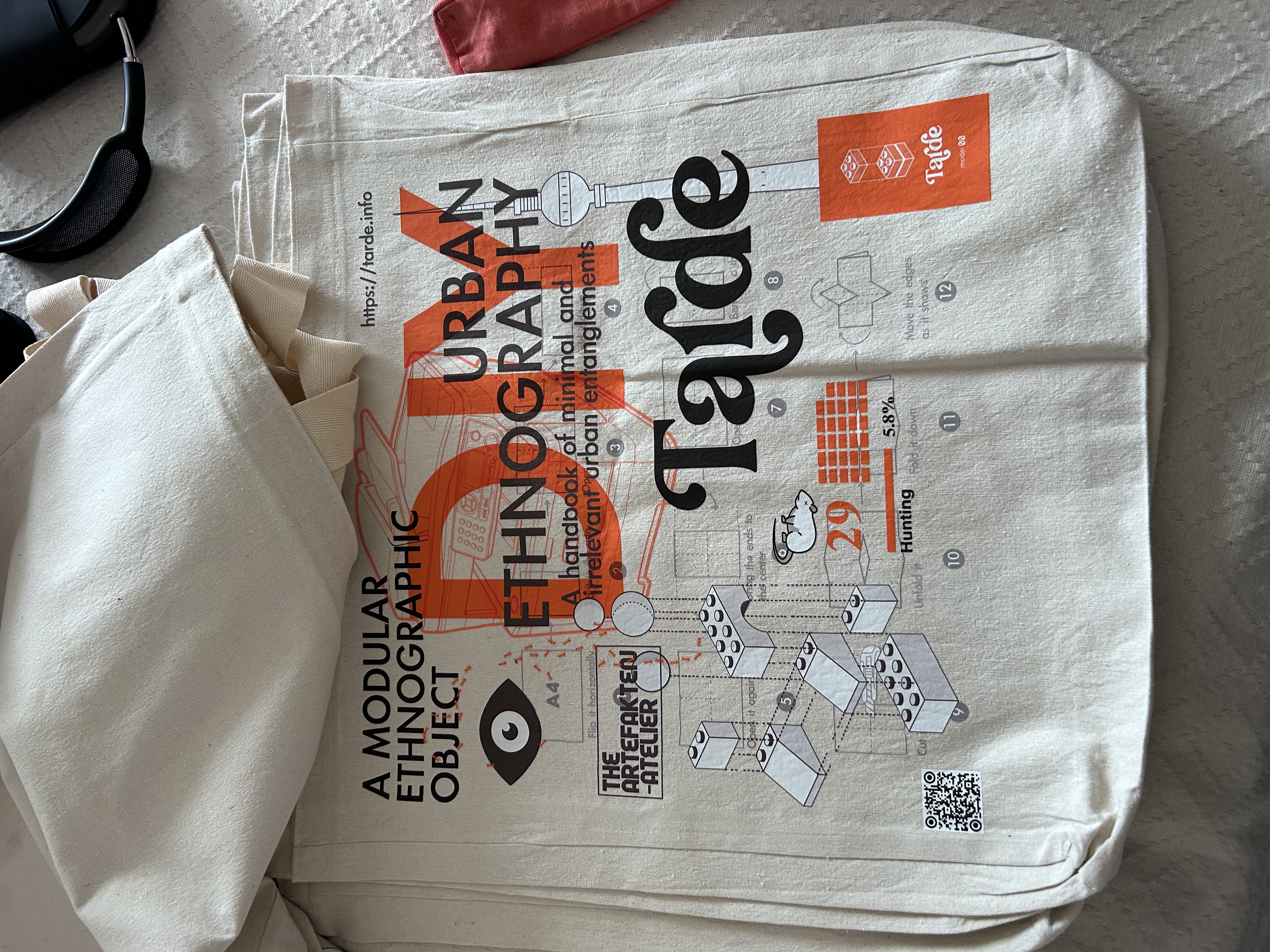 We just launched an incredibly small number of a limited edition of this tote bag. This is just our first step in an effort to explore other media and techniques to expand Tarde and its scope. Besides the academic interests behinds this project, to explore the minimal and irrelevant of urban life, there is also a constant concern in experimenting with other ways of producing ethnographic knowledge. In the (near) future, we would like to delve into new formats: posters, bags, shirts, and all types of printed devices where we can share our ideas and findings. Additionally, non-printed spaces and products are currently on the table, being tested and analyzed. But that is something we will talk about later. For now, we are happy to introduce this bag. Due to the small number of units, this tote bag will be pickily distributed around to get some thoughts and feedback, and we hope to come back with a bigger number (and perhaps a different edition) in September 2024. Stay tuned!