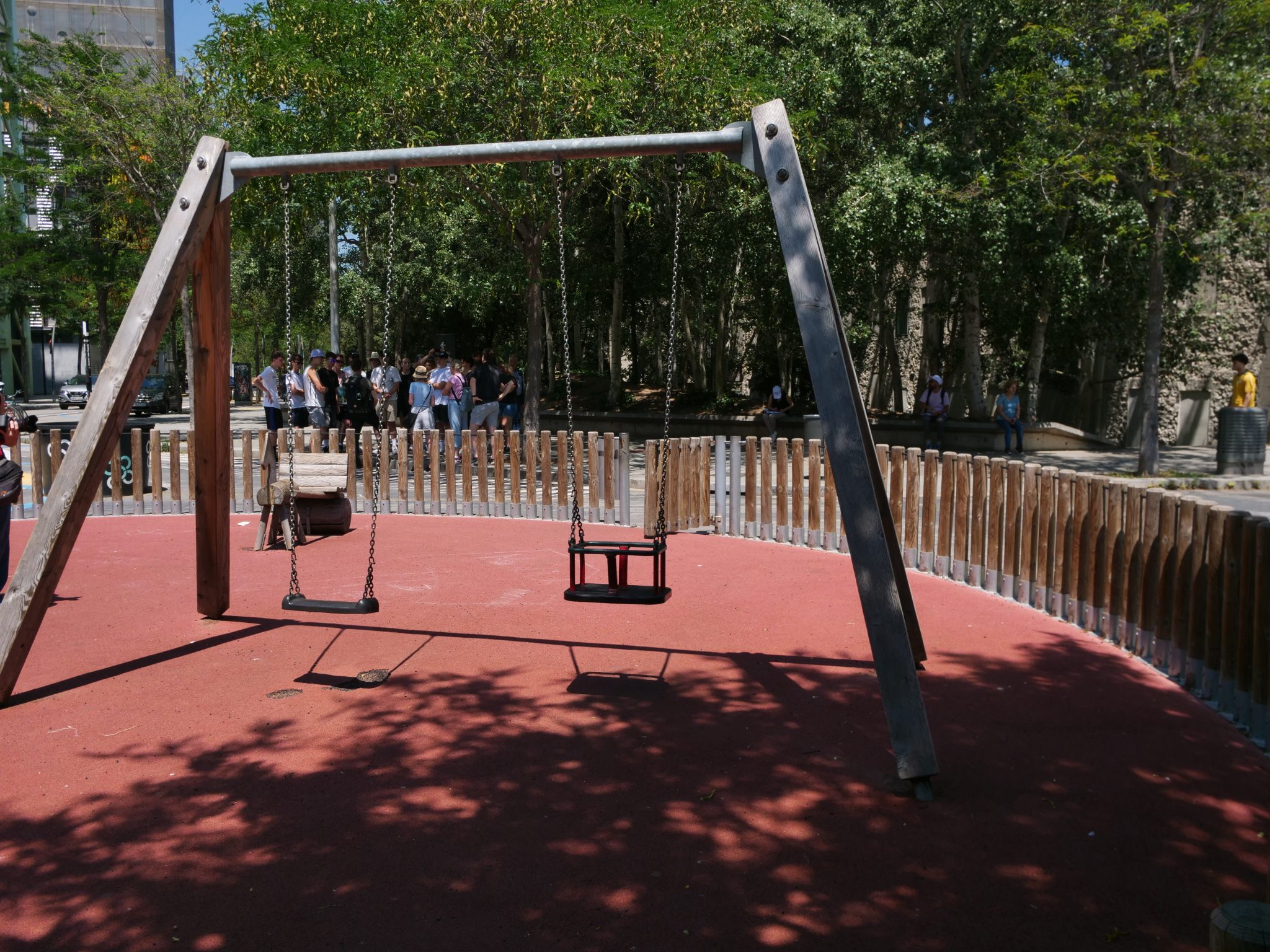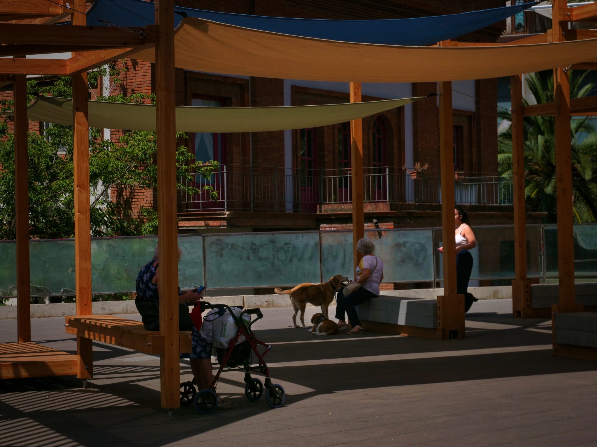 Our workshop took place mostly in the Sant Martí district of Barcelona, where the Poblenou neighbourhood is located. This is where I live and work, and my previous experience walking around with my daughters informed the selection of the places. But we also ventured beyond it when visiting the places where the municipality’s shade prototypes were to be emplaced and installed. This experimental journey also took us to the seafront of Barceloneta, then to the immense gap between large buildings of the Maresme-Forum over one of Barcelona’s main ring roads, or to the highline of the Sants district, created over the transportation box that the underground and commuter trains use to traverse the city.
