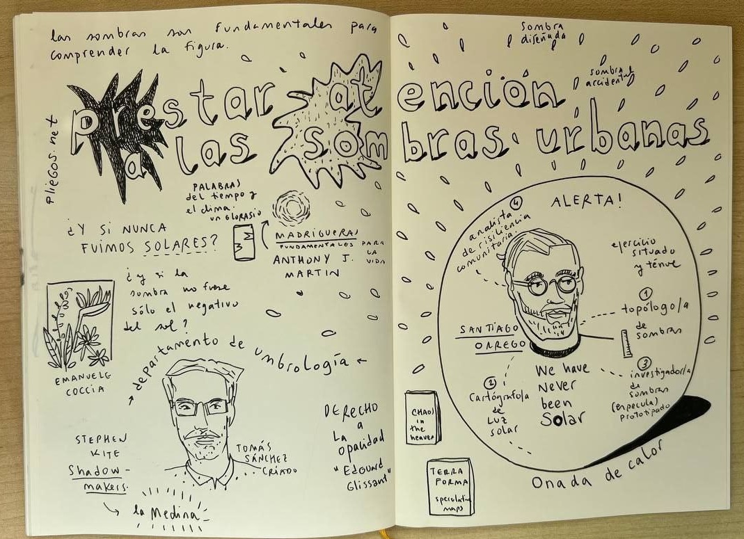 The concrete setting to materialize this speculative scenario took us around six months of on-and-off preparatory work. It happened in and around an open 5-day workshop, The City of Shades, in Barcelona on June 17-21, 2024 [4]. Organized in collaboration with Santiago Orrego, the workshop was backed by my own Ramón y Cajal research funds and a small amount of funding and promotion for the Architectural Weeks of Barcelona. The workshop was put together in collaboration with the City of Barcelona’s Climate Change and Sustainability Office and BIT Habitat, a foundation from the municipality whose mandate concerns deploying internal innovation mechanisms within the city hall and fostering the city’s innovative ecosystem to face municipal challenges.