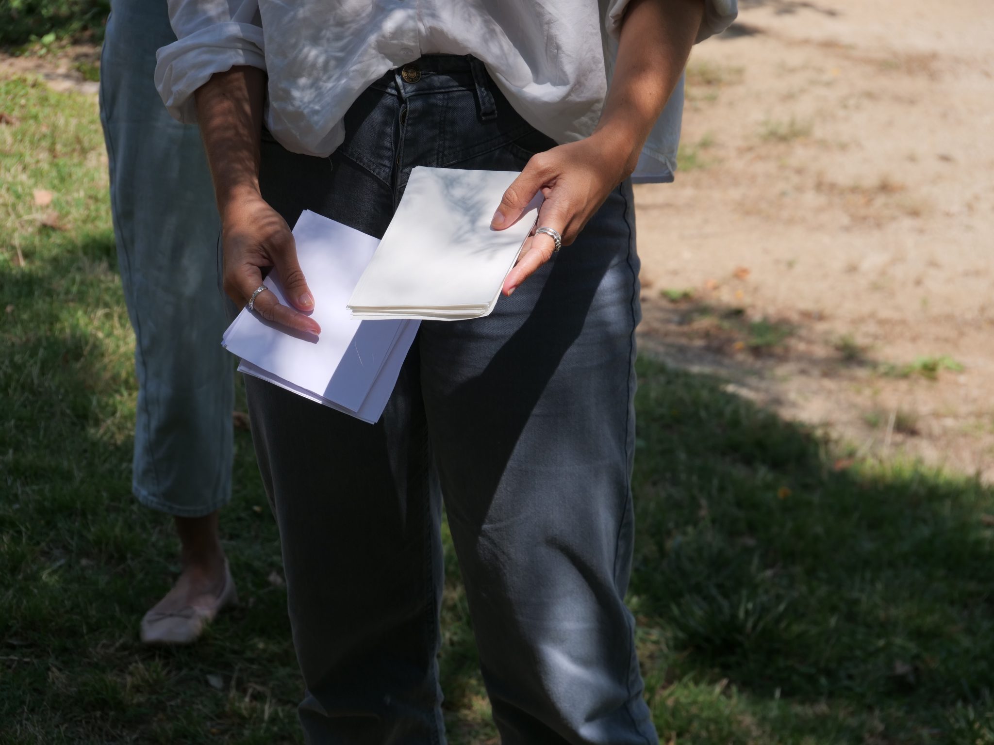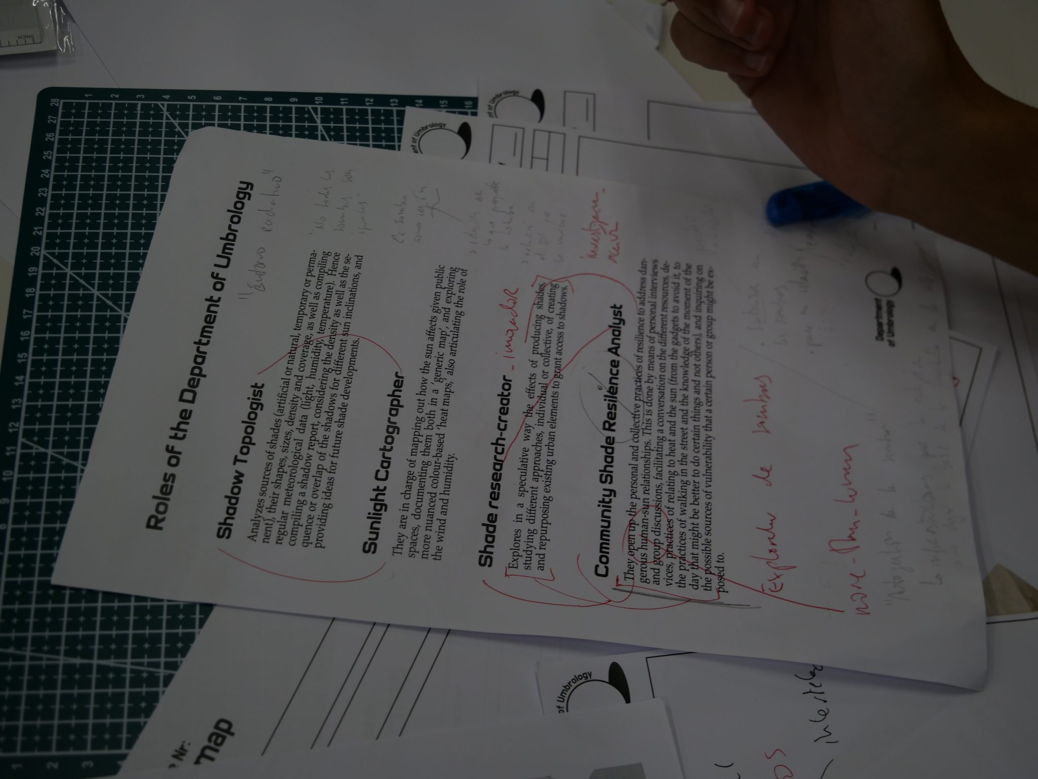To render this practicable, we imagined umbrologists would require a series of roles, such as: (1) Shadow topologist, (2) Shade research-creator, (3) Sunlight cartographer, and (4) Community Shade Resilience Analyst. For each of these roles, we provided a small description and designed a series of specific forms, enabling the DoU to be imagined as a department of sorts: working ‘in the shadows’ of real ones, re-signifying what ‘shadowing’ tends to mean in common ethnographic parlance [8]. We also created a logo, a website, and baseball caps each of the participants could wear to protect from the scorching sun in our urban explorations as a way to enforce an idea of corporate identity and to become noticeable when moving around. The materials gathered in Tarde’s issue 6 and its zine were the main outcome of this preparatory effort. Indeed, the long essay was the discursive opening of the workshop, and the zine contained some of the forms we conceived and tried out.