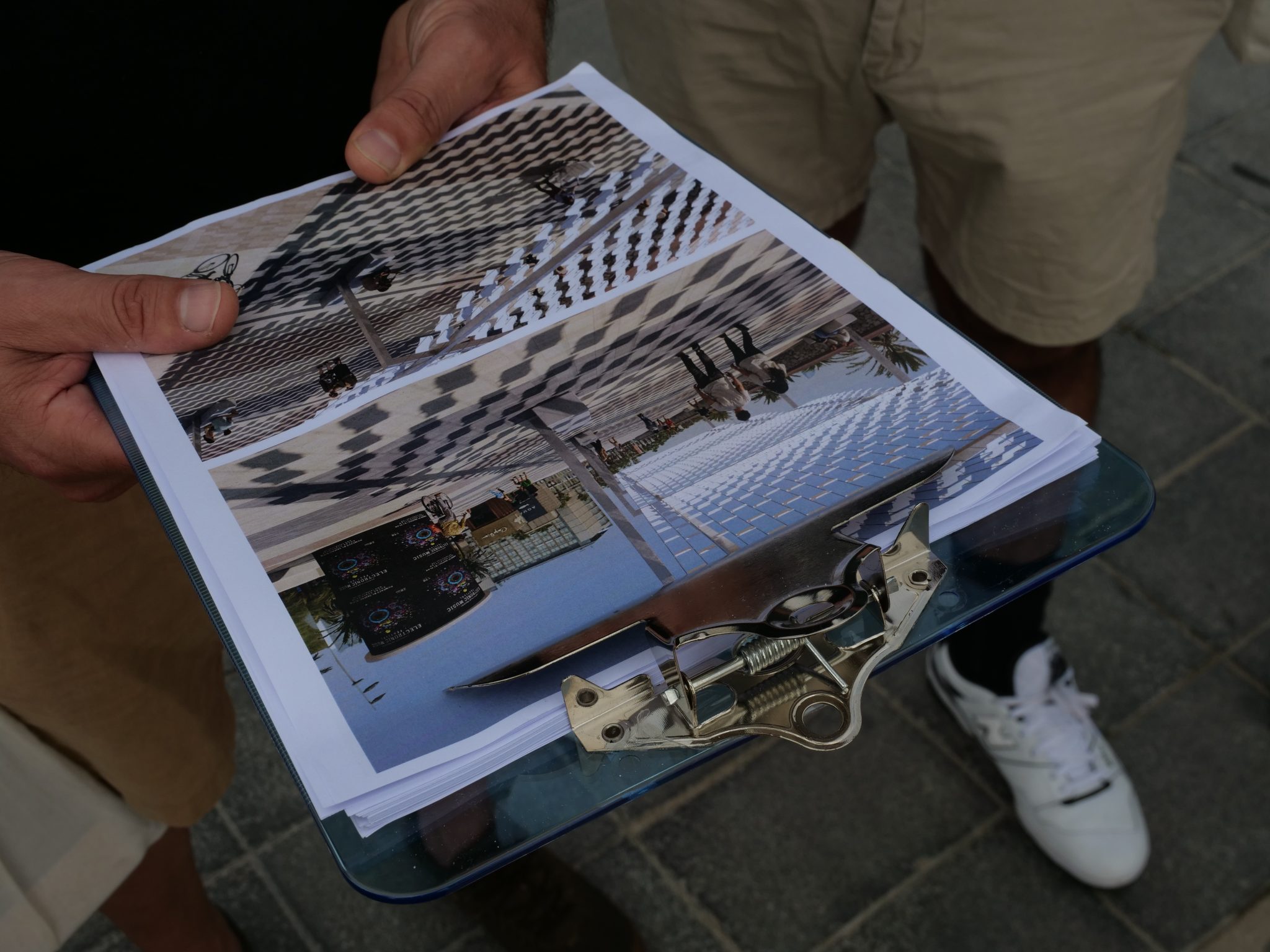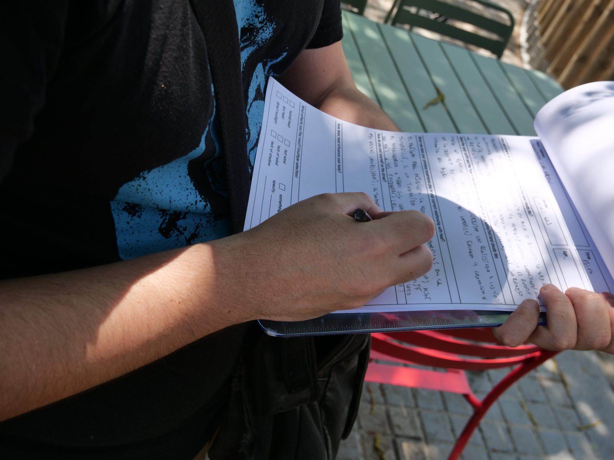 Even if thinking on the relations between shades, architecture, and heat practices has proven an extremely creative conceptual exploration from the onset, my ethnographic work remained confidential and tied to an activity of minute-taking: filling up pages and pages of a notepad to remember rather dense technical details. This is where the idea of a collective and public-oriented Department of Umbrology, where to inquire and discuss intuitions on the urban life of shade with others, became an interesting hypothesis to explore and experiment with forms of ethnographic relevance in the vicinity of all the other technical actors I have been collaborating with: not treating ‘the social’ as a closed category in advance (what the material or the climatic is not, the human factor), nor invoking it after the fact (providing sanctioning takes about technology acceptance) but rather evoking its emergent, everyday and ongoing creative process. To do this, we needed to imagine ways in which ethnography could come to matter: hopefully opening up what the social might mean in different shady locations, enabling more nuanced takes on the complex social and material life of shades and their forms of urban care.